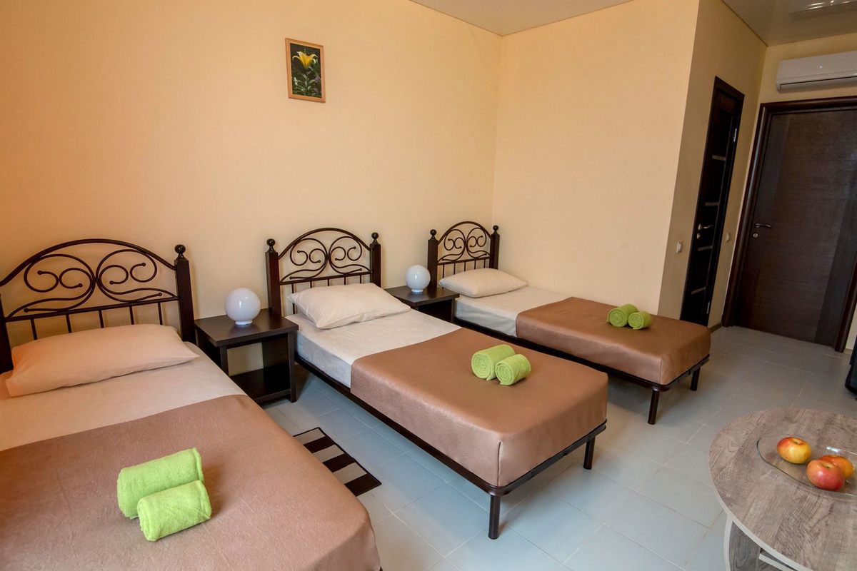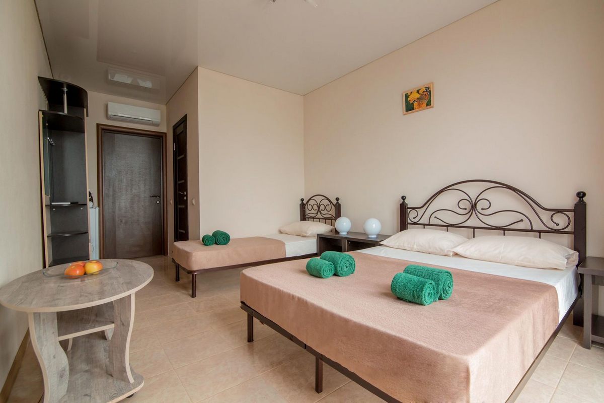 В номере: двуспальная кровать и одна односпальная либо три односпальные кровати, прикроватные тумбы, стол, шкаф для одежды, кондиционер, ЖК телевизор, Wi-Fi, холодильник, электрочайник
